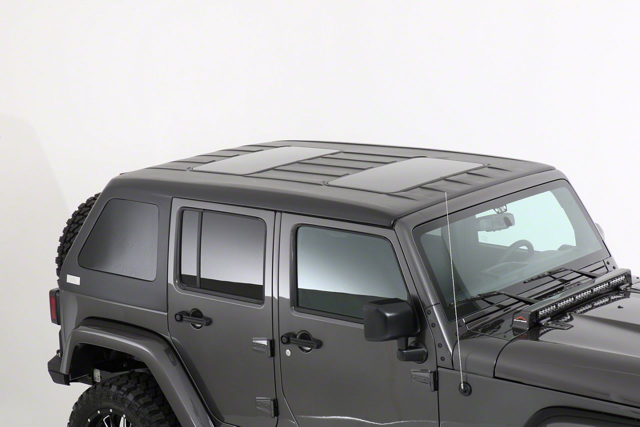 Rally top s hardtops for jeep cj and wranglers are available with or without a roof rack these jeep hardtops feature dot approved tempered safety glass with 30 tinted windows unlike other cheap hard tops rally top s hardtops have fully carpeted interior weather guard insulation and rear hatch struts.